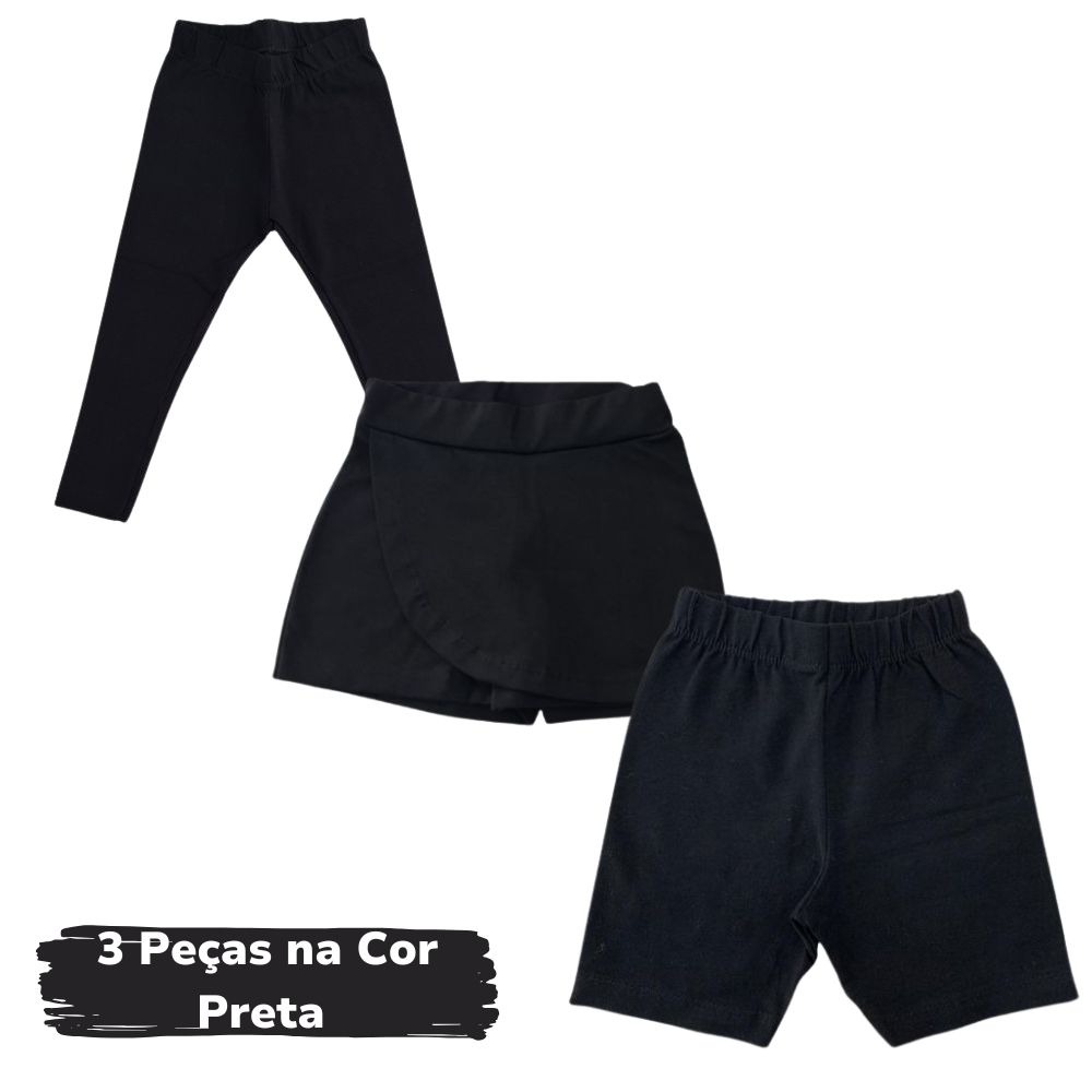 Kit Escolar 3pçs – Legging + Short Saia + Ciclista (Preto)